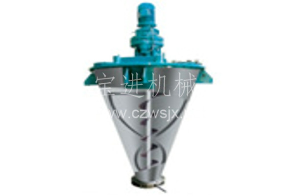 由擺線針輪減速機(jī)連接中心螺桿及外層螺帶以相同轉(zhuǎn)速轉(zhuǎn)動。工作時,中心螺桿將混合物料由底部提升到頂部,同時線速度較大的外部螺帶將物料由下而上沿錐形筒壁盤提升,二種運動在離心力作用下又將物料沿切線方向拋向空間,物料產(chǎn)生強(qiáng)烈的對流剪切、擴(kuò)散,從而達(dá)到快速混合的目的。(螺桿也可做成反向螺桿)。
