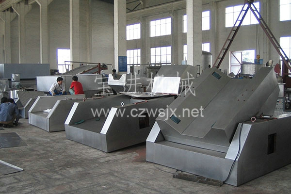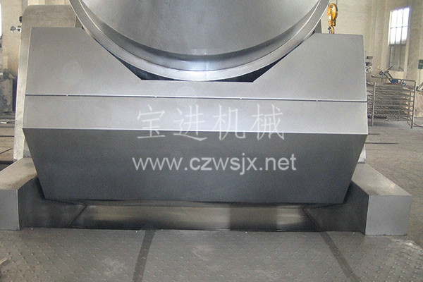 二維混料機(jī)主要由轉(zhuǎn)筒、擺動(dòng)架、機(jī)架三大部分構(gòu)成。轉(zhuǎn)筒裝在擺動(dòng)架上,由四個(gè)滾輪支撐并由兩個(gè)擋輪對其進(jìn)行軸向定位,在四個(gè)支撐滾輪中,其中兩個(gè)傳動(dòng)輪由轉(zhuǎn)動(dòng)動(dòng)力系統(tǒng)拖動(dòng)使轉(zhuǎn)筒產(chǎn)生轉(zhuǎn)動(dòng),擺動(dòng)架由一組曲柄擺桿機(jī)構(gòu)來驅(qū)動(dòng),曲柄擺桿機(jī)構(gòu)在機(jī)架上,擺動(dòng)架由軸承組件支撐在機(jī)架上。