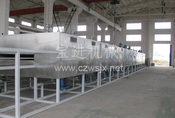 物料由加料器均勻地鋪在網(wǎng)帶上,網(wǎng)帶一般采用12-60目不銹鋼絲網(wǎng),由傳動裝置拖動在干燥機內(nèi)移動。干燥機由若干單元組成,每一單元熱風獨立循環(huán),部分尾氣由專門排濕風機排出,廢氣由調(diào)節(jié)閥控制,熱氣由下往上或由上往下穿過鋪滿物料的網(wǎng)帶完成熱量與質(zhì)量傳遞的進程,帶走物料水份。網(wǎng)帶緩慢移動,運行速度可根據(jù)物料溫度自由調(diào)節(jié),干燥后的成品連續(xù)落入收料器中。上下循環(huán)單元根據(jù)用戶需要可靈活配備,單元數(shù)量亦可根據(jù)需要選取。